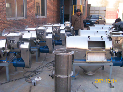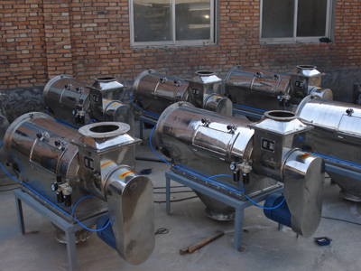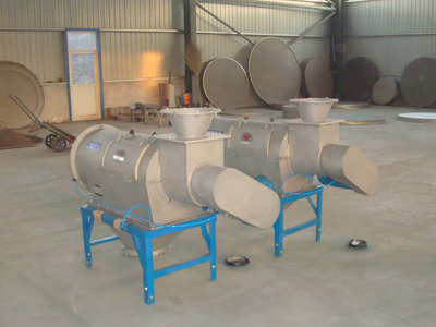 本設備篩網為圓筒狀,置于機體內,物料通過螺旋輸送系統(tǒng)后,和氣流混合、霧化進入網筒內;通過網筒內風輪葉片使物料同時受離心力和旋風推進力,從而迫使物料噴射過網,由細料排出口排出,不能過網的物料沿筒壁從粗料排出口排出。